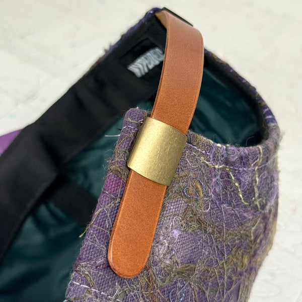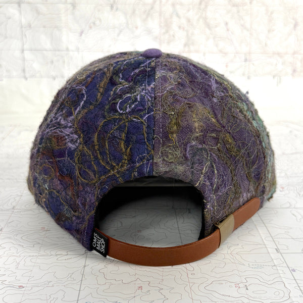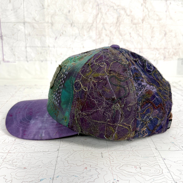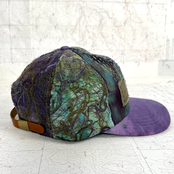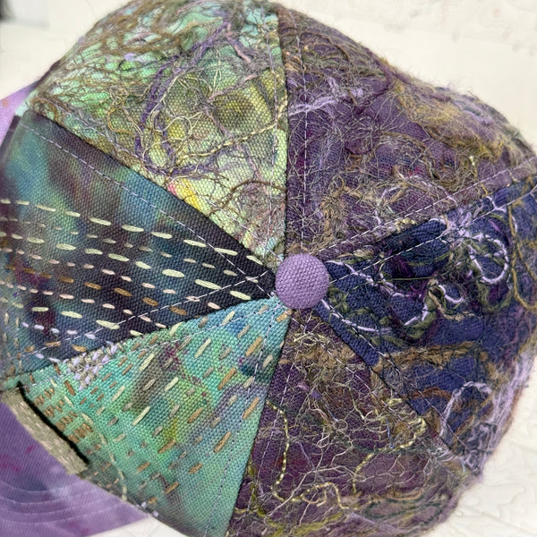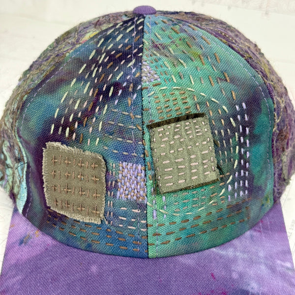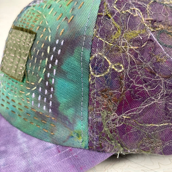 - Scrapwork embroidery on hand dyed canvas with hand embroidered front panels and hand dyed fabric brim